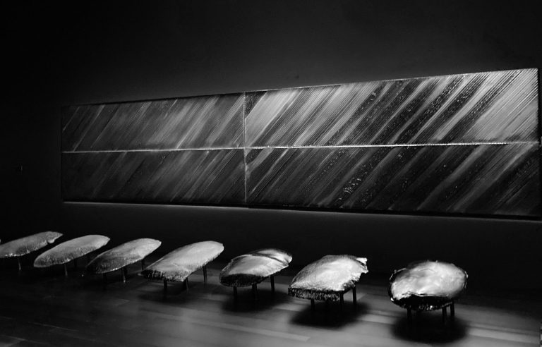 Depuis plusieurs années, le musée Soulages propose des rencontres ponctuelles entre ses collections permanentes et d’autres créations anciennes et contemporaines. Ces dialogues offrent des résonances fécondes pour penser l’œuvre de Pierre Soulages et renouveler sans cesse le regard qu’on porte sur elle. En 2020, le musée accueillit ainsi le Prince de Gudea, statue acéphale en diorite noire du Musée du Louvre (2120 avant JC) ; l’eau-forte de Rembrandt, Faustus (1652), un lavis de Victor Hugo ; et le Bord de mer à Palavas de Gustave Courbet (1854), issu des collections du musée Fabre de Montpellier. Tout cela, à l’occasion des cent ans du peintre. En 2022, ce fut Pedret (2015), une céramique géante noire, sphérique, de Claudi Casanovas, dans le cadre de l’exposition « RCR arquitectes, Ici et ailleurs. La matière et le temps ».